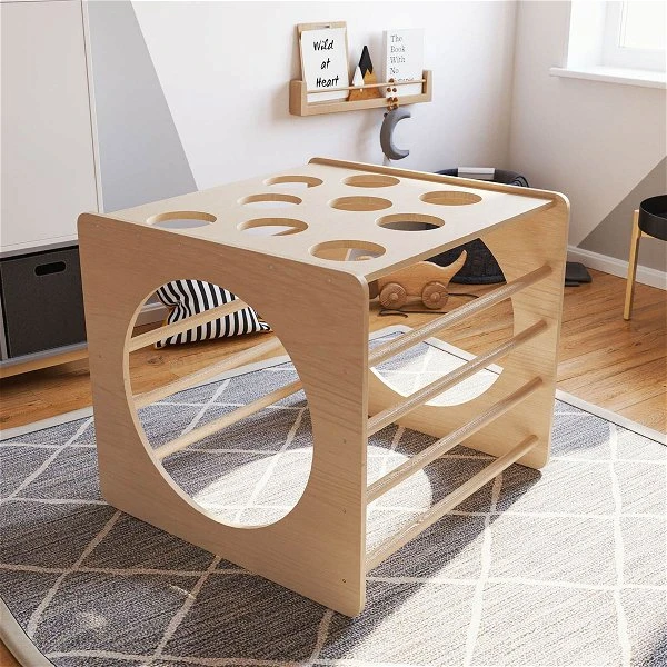 Die stabile Konstruktion aus Kiefernholz verträgt so einiges, sie kann auf allen Seiten stehen, je nach Anwendung oder Vorstellung der Kinder, die vier Seiten mit Löchern oder Sprossen, bringen immer wieder neue Ideen hervor.