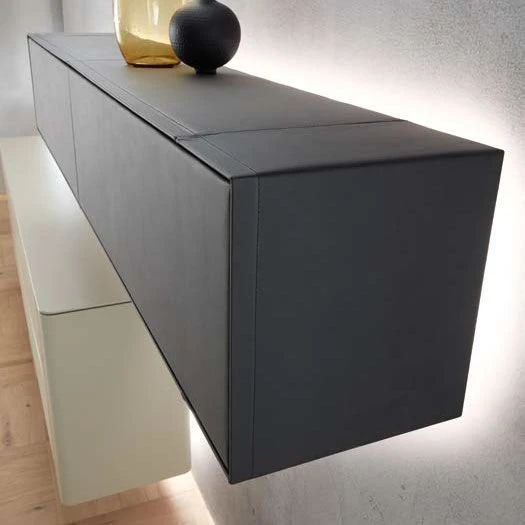 Für diese hülsta Gentis Wohnwand 1 ist die Installation einer indirekten Beleuchtung möglich (siehe Foto). Diese besteht aus einem Funktionsrahmen (Lack weiß) für jedes Element und der entsprechenden LED-Beleuchtung für die Funktionsrahmen. Gesteuert wird die Beleuchtung über eine Funkfernbedienung mit Farbtemperaturwechsel (kaltweiß – 6500K bis warmweiß – 2700K).