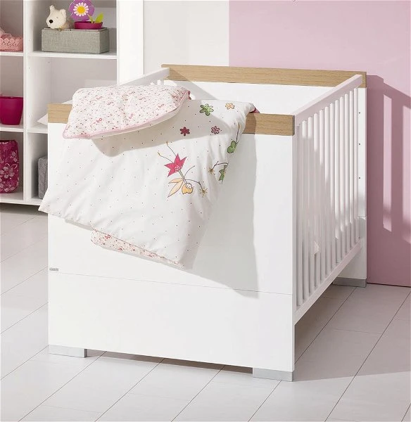 Das Kinderbett Kira besitzt ein geschlossenes Kopf- und Fußteil in edler Optik. Es ist mit 2 herausnehmbaren Schlupfsprossen ausgestattet. Diese erleichtern dem kleinen Bewohner zu gegebener Zeit den Ein- und Ausstieg.