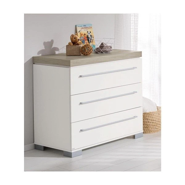 Die Paidi Kira Kommode ist schlicht in kreideweiß gehalten. Die 60 mm starke Deckplatte ist in Eiche-Nautik abgesetzt und verleiht durch die schwebende Optik eine zeitgemäße Leichtigkeit. Die Kommode ist mit 3 geräumigen Schubkästen ausgestattet, von denen der obere Schubkasten einen Vollauszug besitzt, damit der gesamte Inhalt gut überblickt werden kann.