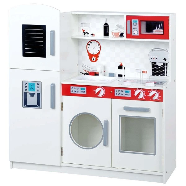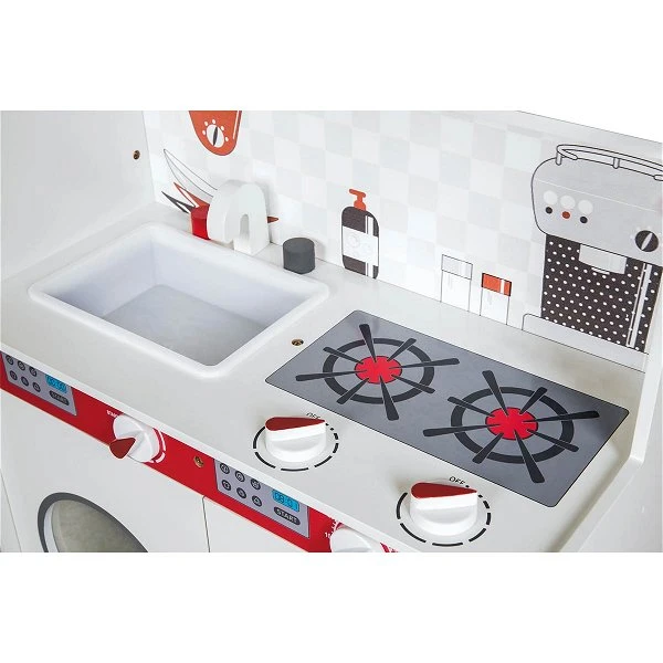 Die Roba Kinderküche lässt Kinderherzen höher schlagen, denn sie ist mit allem ausgestattet was eine Küche benötigt. Ein Herd, ein Backofen, eine Waschmaschine, ein Gefrier- bzw. Kühlschrank und eine beschreibbare Tafel, so wie eine Mikrowelle und eine Spüle mit Wasserhahn laden zum Spielen ein. Die Bedruckung mit Bedienknöpfen, Uhr, Kaffeemaschine, Eiswürfelspender und Küchenzubehör verwandelt die Roba Kinderküche zu einem echten Blickfang.