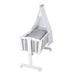Mit dem Roba Komplettwiegenset lassen sich die Kleinsten wunderbar in den Schlaf wiegen. Die weichen und liebevoll gestalteten Kinderbettausstattungen sowie ein kuschelig gepolsterter Einhang machen das Schlummern besonders bequem. Wenn die Bewegung einmal zuviel werden sollte, lässt sich das Roba Komplettwiegenset schnell und einfach mit einem Feststellknopf fixieren.