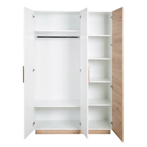 Der roba Lion Kleiderschrank überzeugt mit einem eleganten und zeitlosen Design. Er verfügt über 3 Türen mit hochwertigen Massivholz Griffen. Die Türen haben eine eingebaute Softclose-Technik wodurch sie sich sanft und leise schließen lassen. Im Inneren befinden sich 5 Böden und eine Metallkleiderstange zur Aufbewahrung der Kleidung.