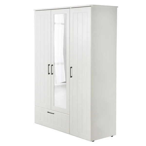 Der roba Sylt Kleiderschrank verfügt über 3 Türen, 1 Schublade und 1 Spiegel mit hochwertigen schwarzen Metallgriffen. Die Türen und Schublade haben eine eingebaute Softclose-Technik wodurch sie sich sanft und leise schließen lassen. Im Inneren befinden sich 5 Fachböden und eine Metallkleiderstange zur Aufbewahrung der Kleidung.