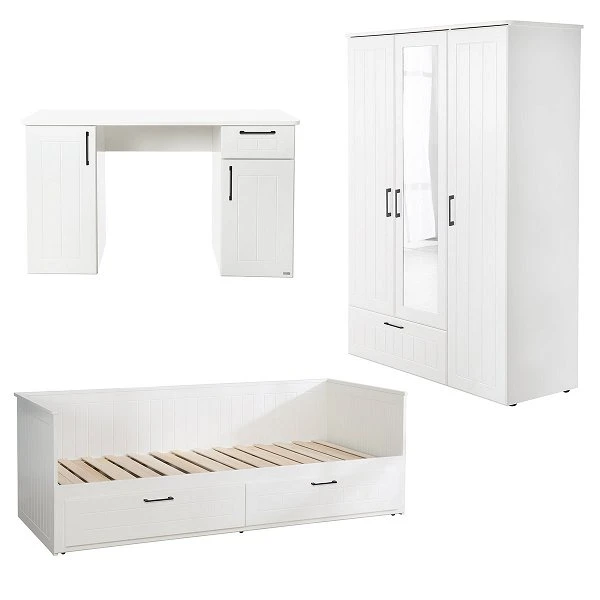 Das roba Sylt Jugendzimmer überzeugt mit einem zeitlosen aber dennoch modernem Design und einer aufwendigen Fräsung an den Fronten und mit Soft-Close-Beschlägen sowie hochwertigen Metallgriffen. Das Tagesbett kann einfach in ein Doppeltbett verwandelt werden und bietet mit 2 Schubladen ausreichend Stauraum. Der großzügige Kleiderschrank mit Spiegel bietet viel Platz für die Kleidung Ihres Kindes und lässt sich durch die Soft-Close Technik sanft und leise schließen. Der Schreibtisch ist ein guter Ort um Hausaufgaben zu erledigen oder seiner Kreativität freien lauf zu lassen. Zusätzlich bietet er genügend Stauraum für alles was man in der nähe des Schreibtisches haben möchte.